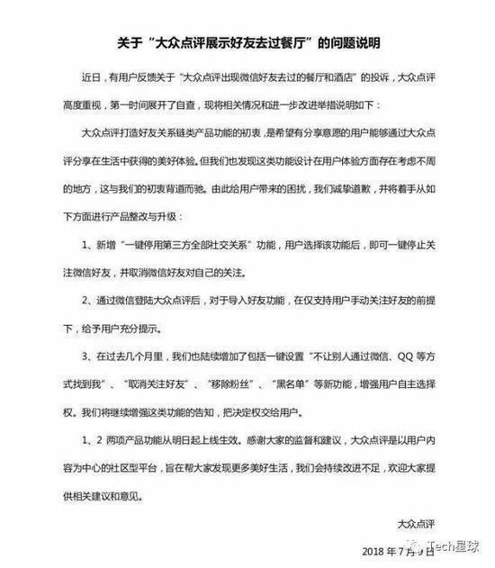 深陷泄露用户隐私漩涡中的大众点评不得不发布通告道歉,并新增“一键停用第三方全部社交关系”功能。